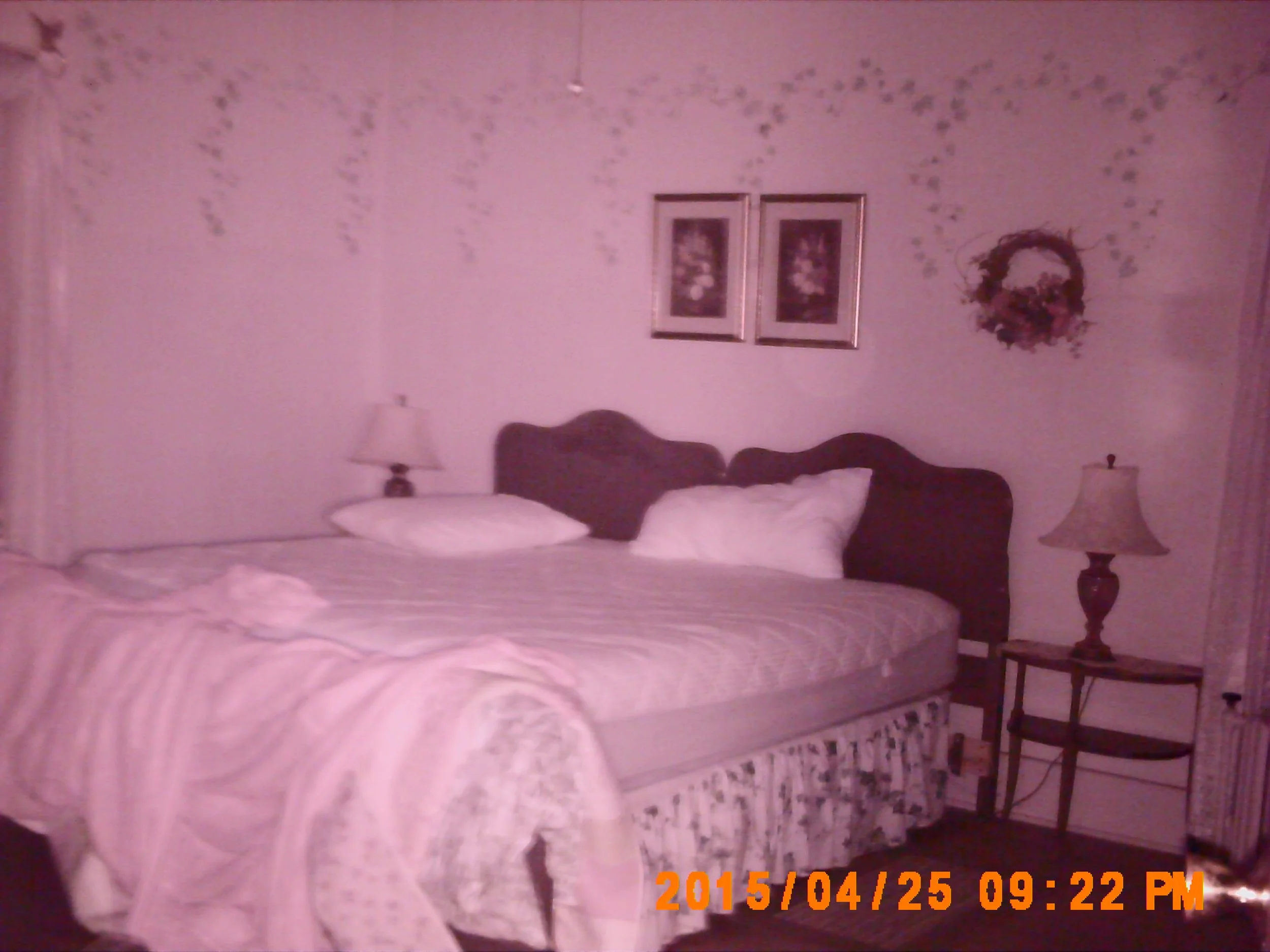 During the EMF sweep of one of the upstairs bedrooms, a high EMF spike of 5 milligauss was experienced twice directly over the bed, then went back down to .01 milligauss. At the same time a photograph from the Full Spectrum camera captured what appears to be an orb shape object over the bed. Numerous photographs were taken though out the inn with no other dust orbs captured in the photographs.